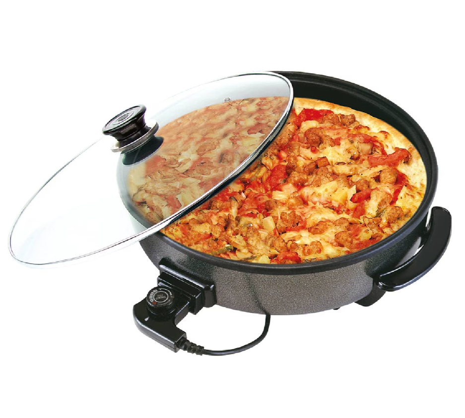 Designul rotund și diametrul mare o fac perfectă pentru pizza, dar și pentru fripturi, legume la grătar, preparate asiatice stir-fry, pește sau deserturi rapide. Oala electrică este prevăzută cu un capac din sticlă termorezistentă, ce permite monitorizarea preparatelor în timpul gătirii fără a pierde căldura acumulată.
